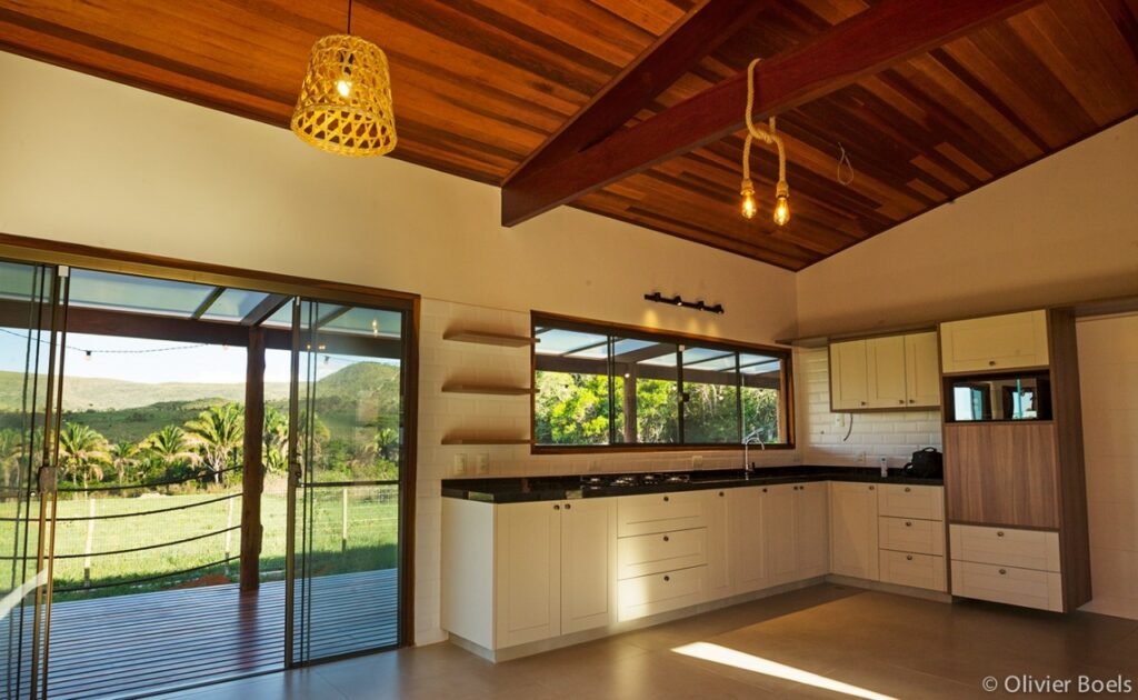 Sala & Cozinha com Pé Direito Alto e Madeira Aparentee Telas Mosquiteiras em todas as portas e janelas da casa. Geladeira Electrolux com Tecnologia Inverter, Microondas Brastemp e Forno Tramontina.